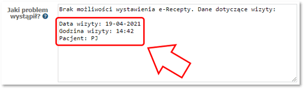 Odczytane informacje należy uzupełnić w opisie zgłoszenia – dzięki temu specjalista ds. wsparcia klientów będzie mógł w łatwy sposób odszukać wizytę w systemie oraz przeanalizować przyczynę problemu i go rozwiązać.